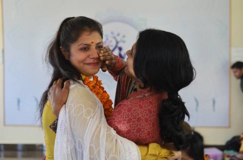 “Fire ritual”, in Sanskrit is referred to as “Hawan” This is conducted in the beginning of the Teacher Training Programme as an opening ceremony. Here, we perform a ceremony asking for blessings of the Universe and pray for the cosmos to guide us, lead us to the light of its knowledge. In this ritual, we offer various medicated and spiritual herbs and ghee into the divine fire to purify the surrounding environment and to enhance the energy/Aura of the place.